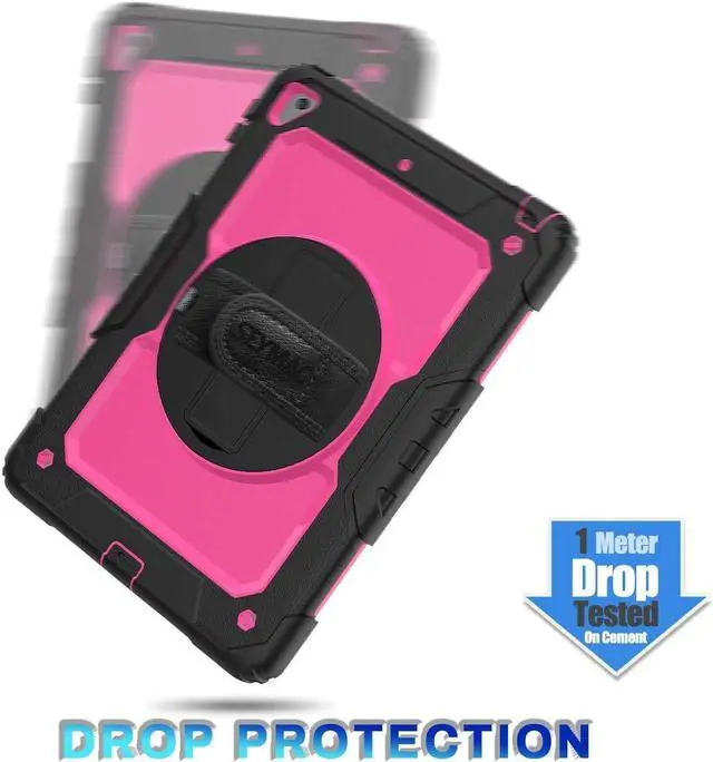 Case for iPad 6th / 5th Generation Case/Air 2 / Pro 9.7 inch, Heavy Duty Protective with Screen Protector, with Pencil Holder, Hand Strap, Shoulder Strap, 360 Rotate Stand, Pink+Black