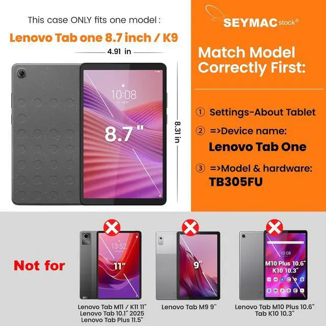 Compatibility: ONLY Compatible with Len-ovo Tab One 8.7 inch / Tab K9 2025 Released. (Model: TB305FU). NOT fits for Tab K10 10.3'' or M9 9'' (Incompatible model: TB-X606F/TB-310FU). Please confirm models: "Settings-About Tablet-Model" before purchase