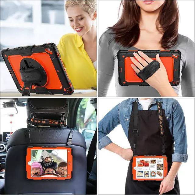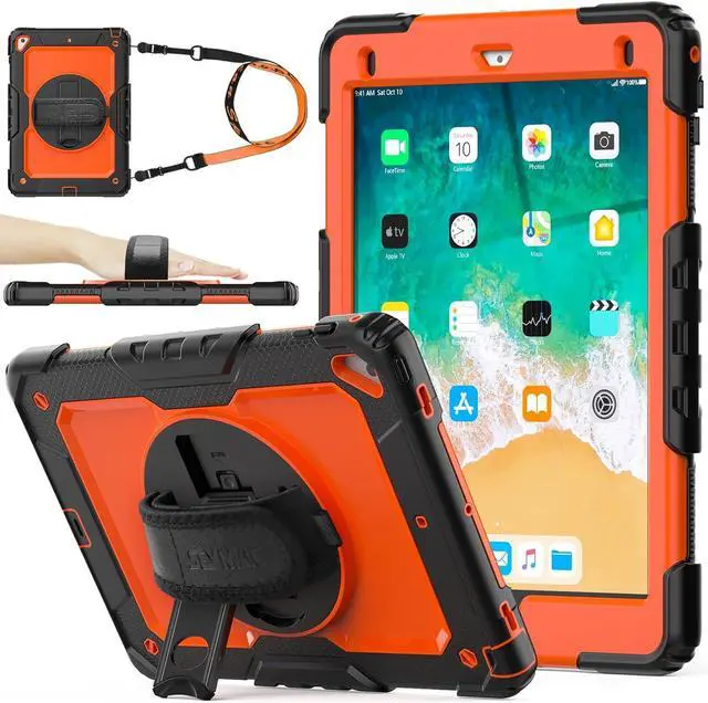 Case for iPad 6th / 5th Generation Case/Air 2 / Pro 9.7 inch, Heavy Duty Protective with Screen Protector, with Pencil Holder, Hand Strap, Shoulder Strap, 360 Rotate Stand, Orange+Black