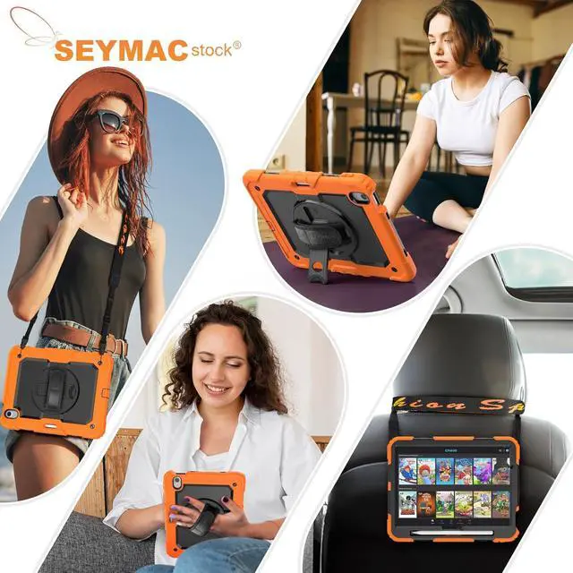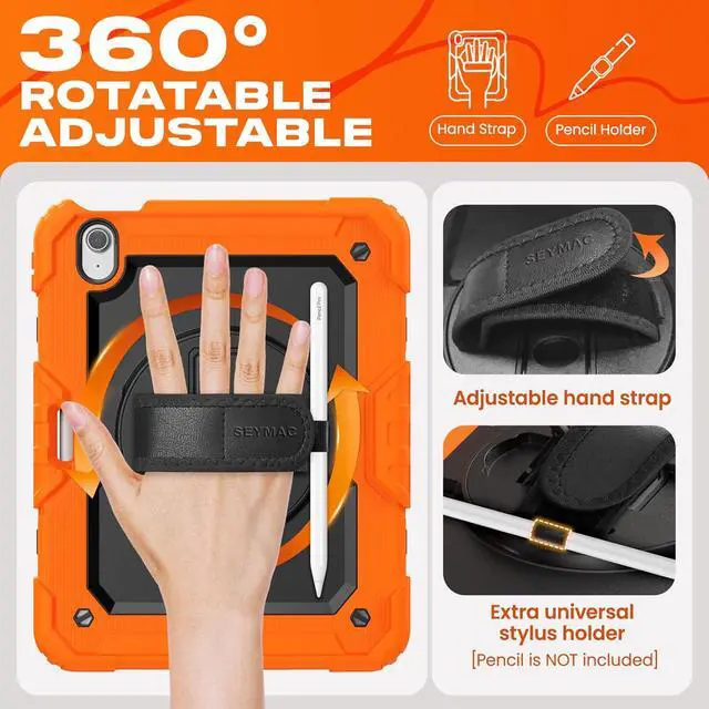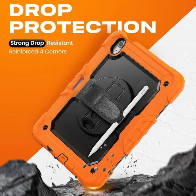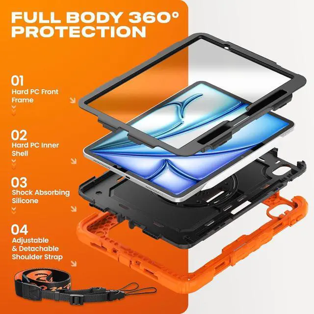 Case for iPad Air 11-inch M4-M2 2026-2024 (Gen 8-6), Shockproof Heavy Duty Case with Screen Protector, Pencil Holder, Rotating Stand, Hand Strap, Shoulder Strap, Orange