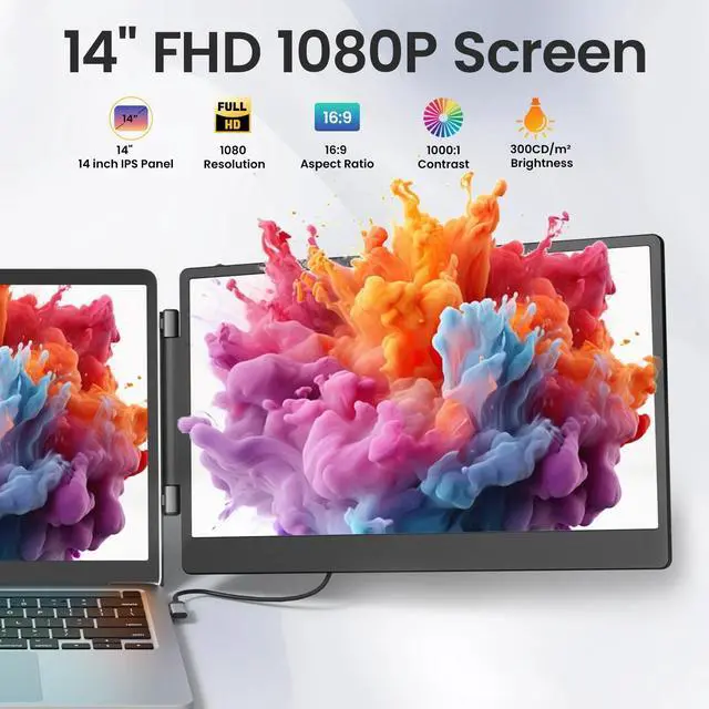 Tlscon Laptop Screen Display Extender, 14 Inch 1080P FHD Portable Monitor with Built-in Stand and Dual Speakers for 13''-16.1'' Laptops, Plug and Play, Compatible with Winds, MacOS, Chrome, PS