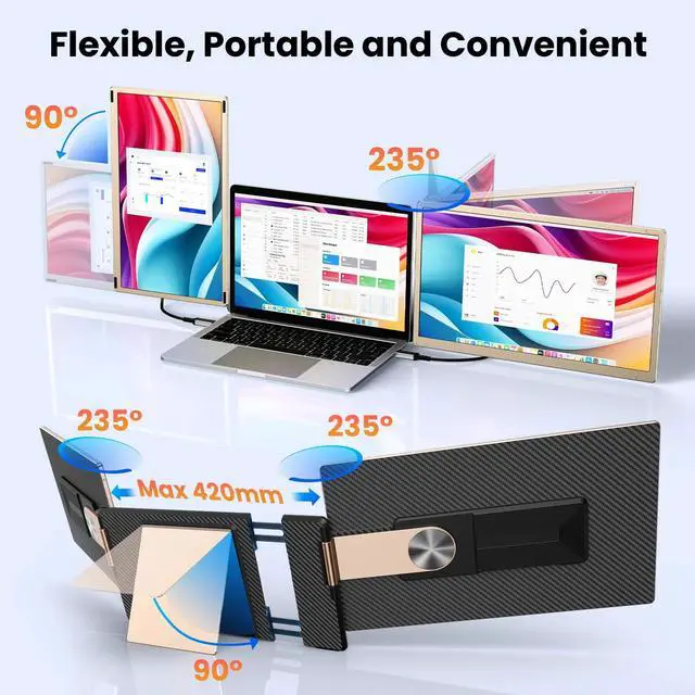Flexible Stand: The versatile stand supports 235° horizontal and 90° vertical rotation, allowing for landscape, portrait, and stacked folding screen configurations.