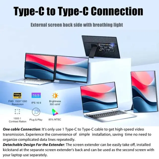 Ultra Portable: This 15.6-inch laptop screen extender features a detachable design with a 360 rotatable stand, supporting various screen configurations such as horizontal and vertical modes.