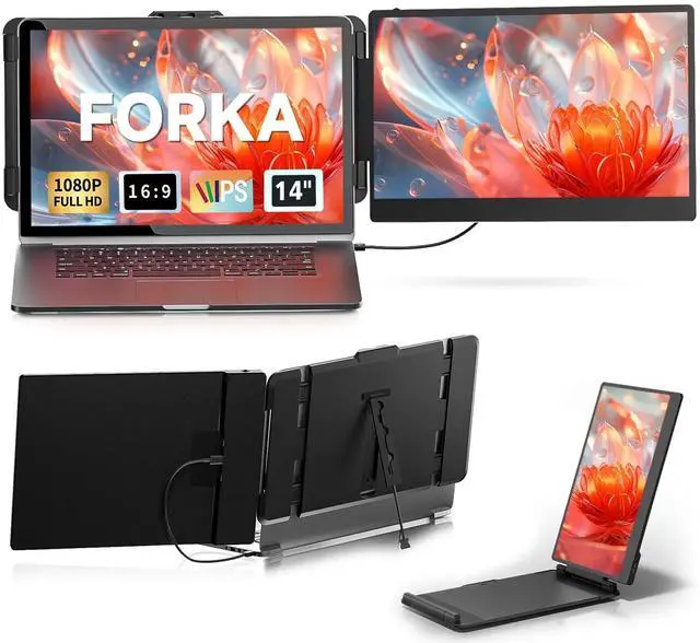 FORKA Portable Laptop Screen Extender - 14" Triple IPS FHD 1080P Monitor, HDMI/USB-A/Type-C, Compatible with Windows & Mac for Travel, Gaming, Work (Max Length: 15.74")