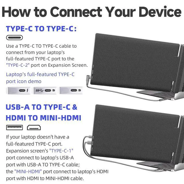 Driverless Operation: No drivers are required; simply connect via USB-C or HDMI. When using HDMI, an additional power supply to the same screen is needed.