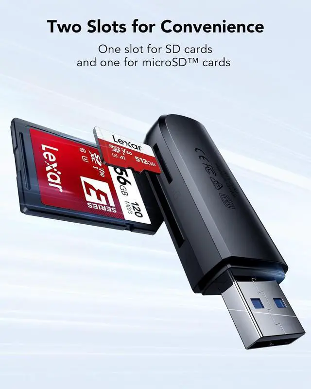 Lexar Dual Slot USB-A Reader USB 3.2 Gen 1 Up to 104MB/s USB-A for SD/MicroSD/SDHC/SDXC Camera Card Reader Adapter OTG MicroSD Card Reader for PC/Laptop/Tablet