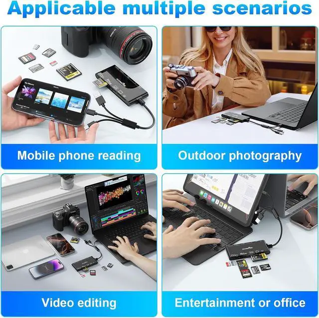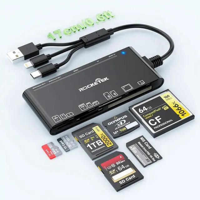 7 in 1 Multi-Card ReaderUSB C Lighting USB 3.0 Multi Card Reader is a powerful device that can read different types of memory cards on various devices including SD*2 TF*2 CF M2 MS cards. Easily transfer photo video and file information.????