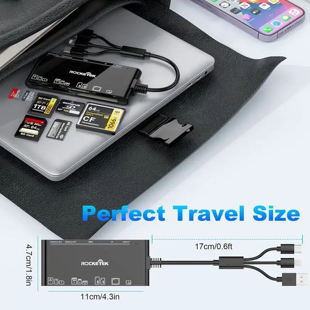 Note: Only Read/Write 1 Cards at one time. 3-IN-1 DesignSD card reader adapter has multiple interfaces comes with lighting/USB/USB C connectors lighting connector compatible with iPhone 14/13/12/11/11Pro/XS /Max/XR/8/7/6 Pad4 Pad Air Pad mini. Type-C connector for iPhone 16 16Pro 15 15Pro 15Plus Galaxy S24 S23 S22 S20 S10 S9 S8 Note 9 8 LG G5 G6 V20 Chromebook Google Pixel Google Nexus 5X 6P. 5Gbps Superspeed Data TransferUSB Lighting USB C SD card hub adapter support memory card up to 5Gbps Transfer high-resolution HD movies images and video recordings to your computer faster and more efficiently. Also backward compatible with USB 2.0 1.1 and 1.0S lim & Compact DesignCompact USB card reader is a great kit for travel. Multi-Card Reader Adapter comes with reinforced USB cable sturdy exterior and heat-resistant connectors ensure high data transmission efficiency and ultimate durability. 30CM USB Removable cable tail would reduce stress on the USB port on your computer and won't affect the use of adjacent ports. Broad CompatibilityMulti Memory Card Reader build-in three different connection compatible with Mac OS iOS Android Mac OS(MacBook pro/MacBook air) Linux Chrome OS Windows XP/Vista/7/8/ 8.1 /10 and etc. Plug and Play.