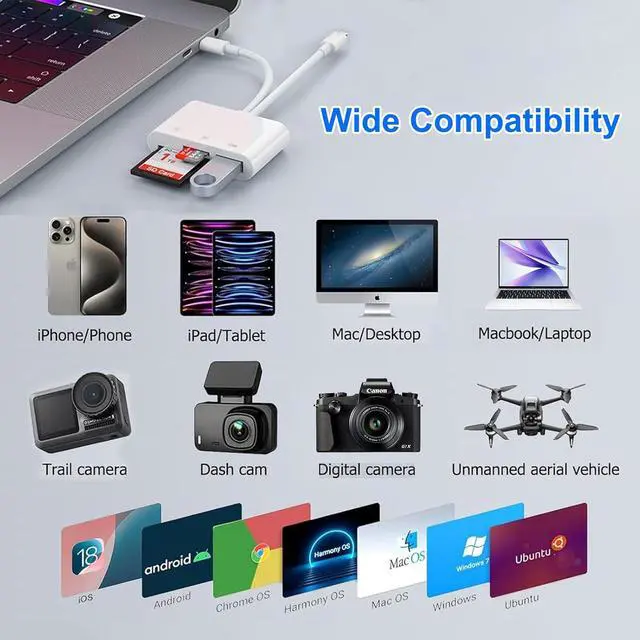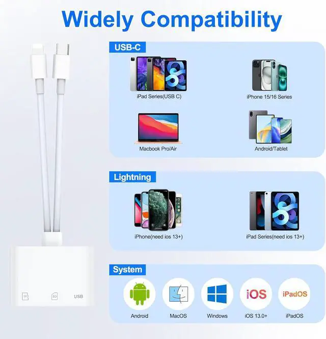 SD Card Reader for iPhone: upgraded SD card reader has dual connectors (usb c & lightning) for iphone 5-14 iphone 15-16 ipad mac andriod phone table type c devices.