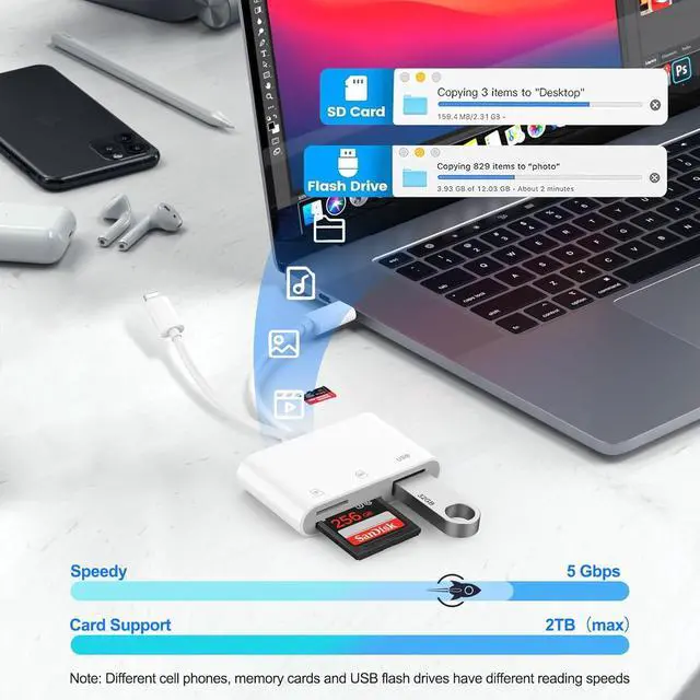 Note: two connector cannot be used simultaneouslyTwo-way fast transmission: SD card to iPhone transfer speed is up to 20 MB/s ~ 30 MB/s. iOS 9.2 - 12.4 system only supports one-way transmission. iOS 13.0 or above system supports two-way transmission. SD/TF/CF card Import the data in the mobile phone/PAD or export the files in the mobile phone/PAD to the SD/TF/CF card. Including movies music Word Power point Excel PDF etc.