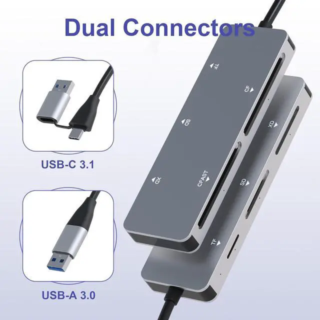 CFast 2.0 Card ReaderSupports CFast 2.0 memory card data transfer. Transfer high-resolution images and video recordings to your computer faster and more efficiently with fast USB 3.0 data transfer rate super-speed 5Gbps. The USB 3.0 is backward compatible USB 2.0 and USB 1.1. Card compatibityCFast 2.0 reader built-in 5 card slots: CFast CF (Compact Flash) SD TF and XD card slots Supports CFast CF SDXC SDHC SD XD CF (Compact Flash) Micro SDXC Micro SDHC Micro SD cards [support CF-I cards]Dual Connectors USB 3.0 USB-C CFast ReaderThis CFast Reader come with one USB A USB C dual connectors cable designed to allow one device to compatible with all variety MacBook Pro Mac Air computer PC laptop and other type-c devices simultaneously. Broad CompatibilityCompatible with Windows XP/Vista/7/8/ 8.1 /10 Mac OS Linux Chrome OS and etc. Plug & play hot-swapping capability; no external power supply required USB bus-powered easy and convenient to carry and use for photographer and videographer. Aluminum Compact DesignThis USB C CFast Card Reader with a compact portable design could save space and easy take. The aluminum alloy cover makes the CFast reader more durable and high quality. What We Offer1 x USB A USB C CFast/CF/SD/TF/XD 5-in-1 Card Reader 1 x User Manual 2-year and friendly customer service. Please feel free to contact us at any time.