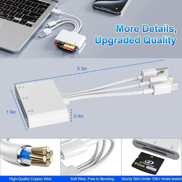 Full Compatibility: Featuring Lightning USB-C and USB-A ports this SD card reader works seamlessly with iPhones iPads computers and Android devices. The three dedicated card slots (SD/TF/XD) support SD SDHC SDXC MicroSD MicroSDHC MicroSDXC and XD Picture Cardsmaking it a versatile all-in-one solution. Ultra-Fast Data Transfer & Broad