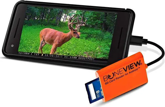 NEW EDITION FOR ALL LATEST TYPE-C ANDROID PHONES - Designed specifically for hunters to instantly view save share and delete your trail camera pictures and videos with your smartphone or tabletREADS ALL TRAIL CAMERA SD AND MICRO-SD MEMORY CARDS from all major trail cameras on the marketINSTANTLY PLUG AND PLAY - No Extra Apps or Gear Required and Still Able to Quickly Swipe Through and Save Thousands of Photos or Play Most Video Files with Super Fast Transfer SpeedsUSE ANYWHERE IN THE WOODS - No Internet Wi-Fi or Cell Service Required Ever No Batteries EitherBUY WITH CONFIDENCE - Bone View will always stand behind their products and make sure they work well for you no matter what