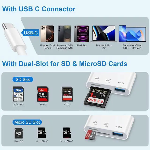 USB Port: The micro sd to usb c is designed with 3 ports compatible with iPhone 16 S25 A16 iPad Mac Android Computers makes it easier to read and transfer SD card data on different devices. 3 in 1 CF SD TF Card Slot in One Card Reader Support SD SDHC SDXC Micro SD Micro SDHC Micro SDXC CF RS MMC Memory Cards. Do NOT Support Wi-Fi SD card. Please note that this device does not support printers or hard disk drives.