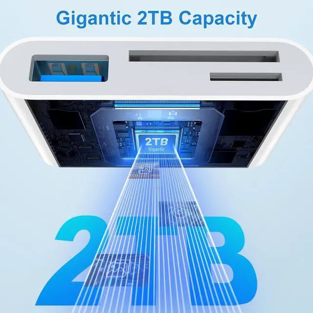 Importing Photos: after inserting your memory card into the reader and connecting it to your iPhone within five secondsopen the 'Photos' app where you will find an 'Import' option that allows you to transfer videos and photos from your memory card directly to your device. Dual Slots &