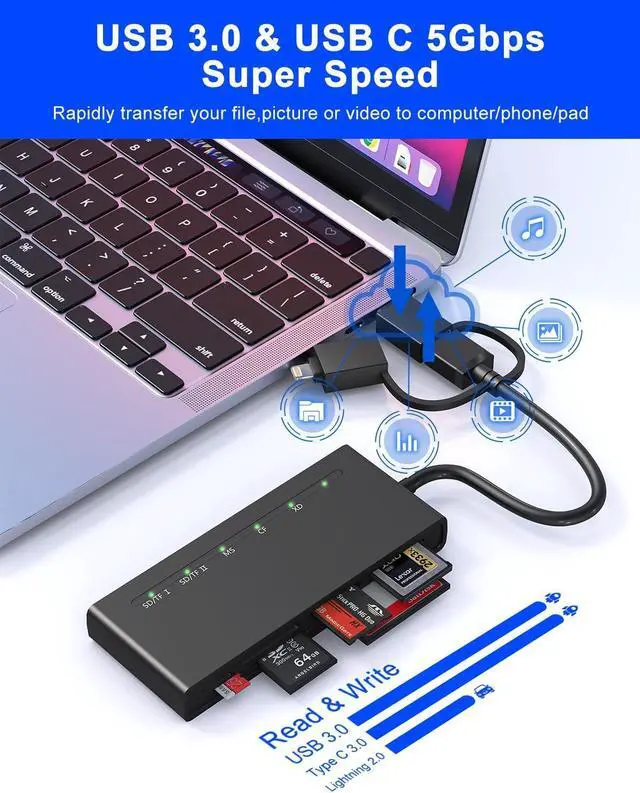 Ultra-Fast 5Gbps Transfer Speeds: Save time with this usb card reader offering USB 3.0 and USB-C transfer speeds of up to 5Gbps (10x faster than USB 2.0 ) and 480Mbps via Lightning. Perfect for photographers and videographers this multi sd card reader easily handles large files from your card reader for camera memory card boosting productivity on every project. Effortless Plug & Play with
