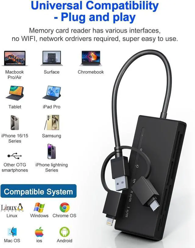 All Your Devices: Designed for versatility this sd card reader usb c features Lightning USB-C and USB A 3.0 connections. It's compatible with sd card reader for iPhone iPads laptops desktops and OTG-enabled smartphones. Enjoy seamless plug-and-play across platforms without the hassle of multiple adapters.