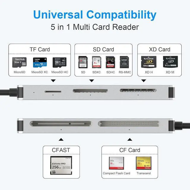 Cfast Reader: This multi memory card reader satisfies your need of almost every single card. There are 1*CFast slot 1*SD 1*Micro SD 1*CF 1*XD at your choice and convenience. Whats more this card reader can Simultaneously read and write on five cards eliminating the effort of plugging in and out and saving more time when sync data. which can greatly improve your work efficiencyUSB-C CFast 2.0