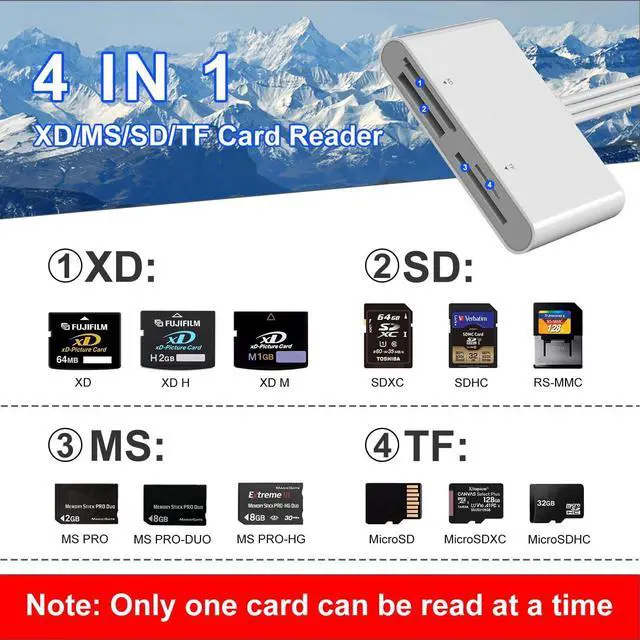 ?? 3-in-1 Multi-Port Design This memory stick duo adapter features Lightning USB-C and USB-A ports which is compatible with various devices and operating systems. Whether your use i-Phone/i-Pad PC or other USB C phone device you can easily connect and use this card reader.?? 4-in-1 Multi-Card Support The memory stick adapter comes with SD/TF/XD/MS four card slots. It supports a wide range of card types such as Memory Stick Pro Duo Memory Stick Pro-HG Memory Stick Duo olympus xD-Picture card SD/SDHC/SDXC and microSD memory card. This design avoided need for separate card readers for each card format thus saving both space and hassle.