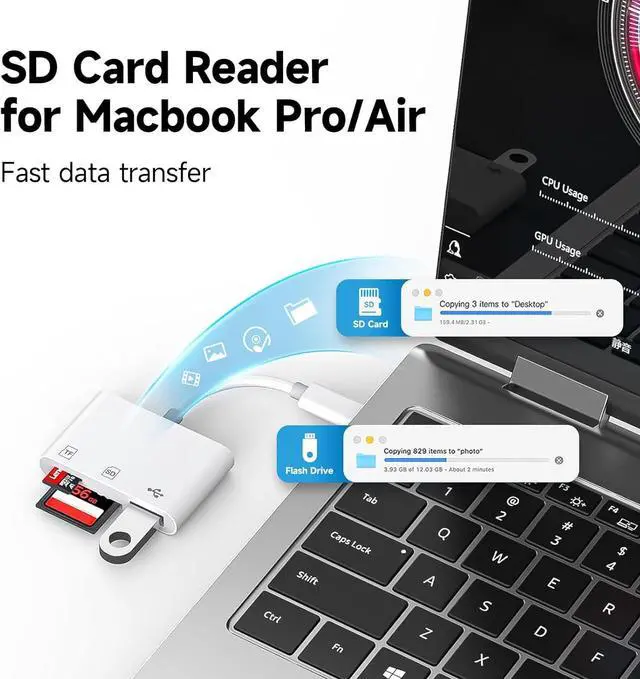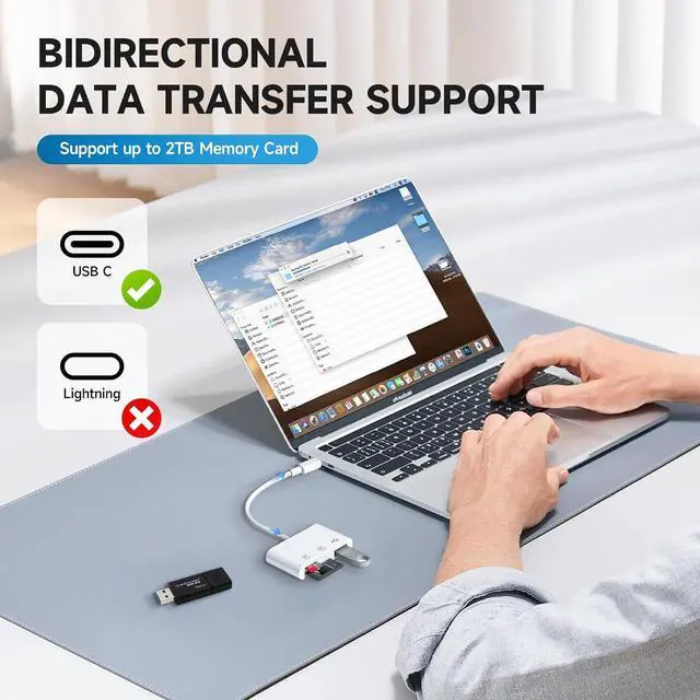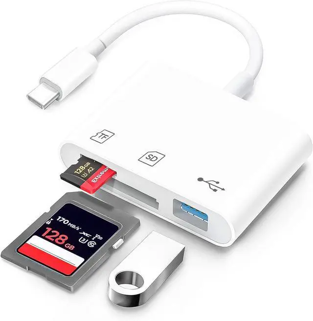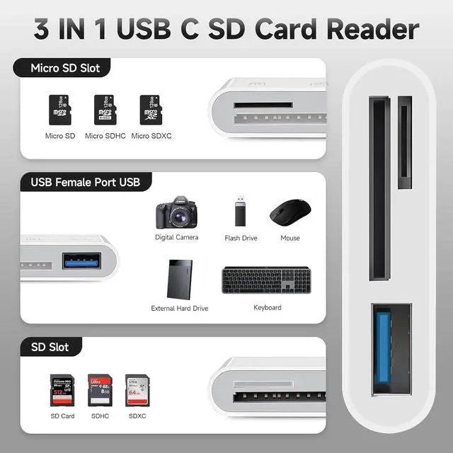 3 in 1 SD Card ReaderThe USB C SD Card Reader is designed with 3 Ports compatible with iPhone 15/iPad/Mac/Android/Computers makes it easier to read and transfer SD card data on different devices. Dual Slots & USB PortUSB C to SD Card Reader has two card slots and a USB port that can read and write from 3 ports simultaneously. The Micro sd card reader work for USB devices such as digital cameras SLRs USB flash drives keyboards and mice. micro sd to usb c reader has the latest robust USB chip not only faster the transfer but also ensures transfer safety.