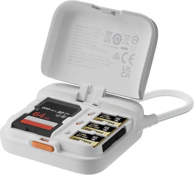 max read speed: 170MB/s). All-in-one USB Type-C cable supports data transfer for phones computers or tablets. Footage can be viewed shared and edited in real-time while transferring. Works directly with devices and supports up to ProRes 4K60 video transfer with compatible memory cards. Built-in secure storage for 6 memory cards. Attaches magnetically to MagSafe-enabled iPhone 15 and later models when used with a compatible case. *Requires a MagSafe-ready model (iPhone 15 or later) or a MagSafe case if using with a phone case. Packs easily with a lanyard-ready cable design for carrying on the go. Read write organize transfer and cut as you go all in one handy tool.