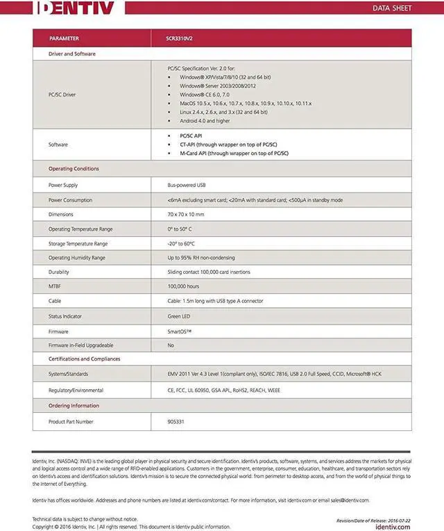 Ergonomic and cost efficient designSoftware and functionality compatible with SCMs SCR33xx readers familyIn field firmware upgrades (SCR3310). EMV Level 1 certifiedCompliant with major smart cards and relevant industry standards
