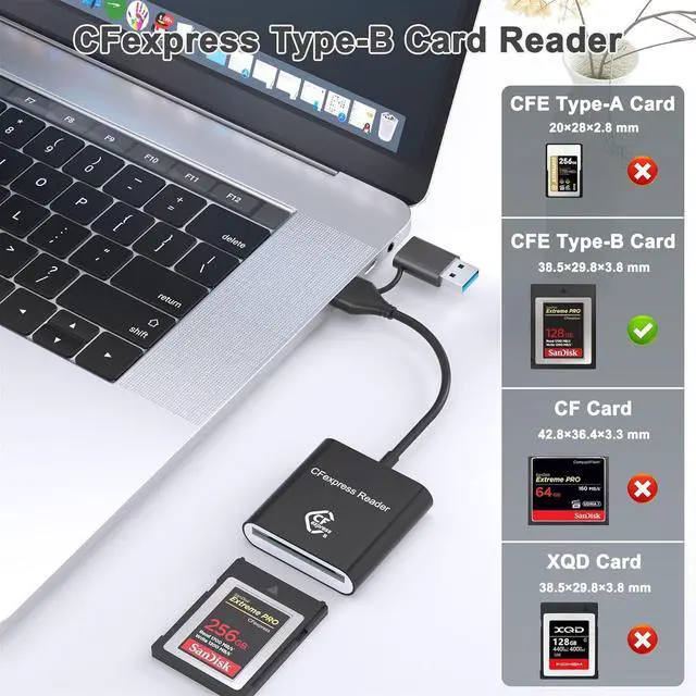 Wide Compatibility: Compatible with most operating systems such as Windows XP/Vista/7/8/ 8.1 /10 Mac OS etc. This CFexpress card reader compatible with CFexpress Type B memory cards.
