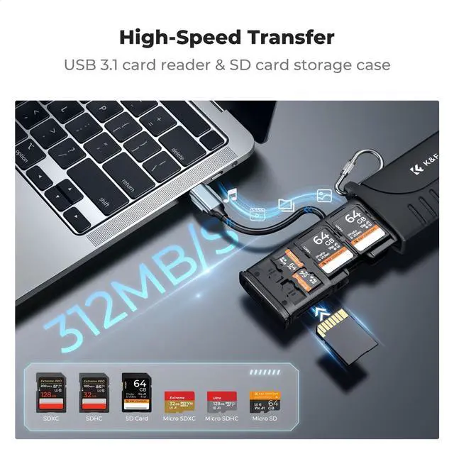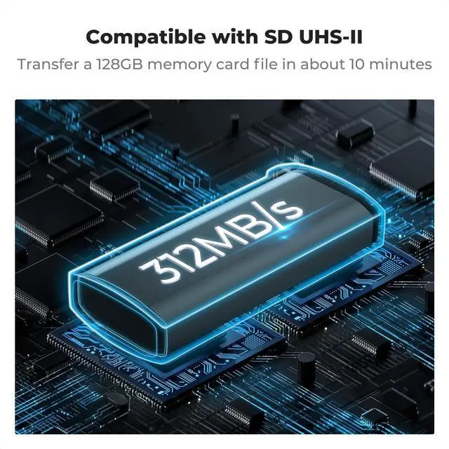 [High Speed Transfer] - USB 3.1 speed with UHS-II protocol support (SD/TF Cards) maximum transfer rate of 312MB/s enabling rapid data transfer. Supports various memory card types including UHS-II SDXC SDHC SD Cards Micro SDXC Micro SDHC Micro SD Cards and UHS-I Micro SDXC Micro SDHC Micro SD Cards. [Extensive Compatibility] - Compatible with standard Windows systems iOS iPadOS macOS Linux and corresponding devices. When only a USB-A port is available use the included USB-C to USB-A adapter for connection without requiring driver installation. [Triple Protection] - Features a sliding-seal design. The multi-functional memory card storage case is protected by an aluminum alloy shell and silicone sleeve featuring IP54 certification for drop resistance dustproofing and protection against rain and splashes.
