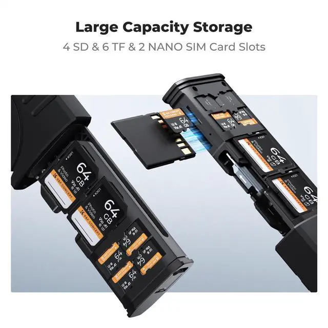 [Card Reader & Storage 2-in-1] - This multi-functional memory card storage case replaces the traditional split card reader and card case and at the same time realizes memory card storage making it neat and convenient to use. Suitable for multi-device users compatible with DSLR drones action cameras mobile phones and other types of memory cards one box to solve cluttered storage. [Large Capacity Storage] - Equipped with 4 SD card slots 6 TF card slots and 2 Nano SIM card slots it supports simultaneous storage of multiple card formats. The dual-slot card reader enables simultaneous reading of SD and TF cards allowing rapid export of footage for editing or sharing.