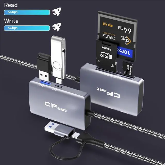 • CFast Card Reader 5 in 2 CFast 2.0 SD/TF Memory Card Reader 5Gbps PD/USB 3.2 Gen 1 Adapter with USB C/USB A Cable Compatible with Windows/Mac/Linux/Android (5 in 2)