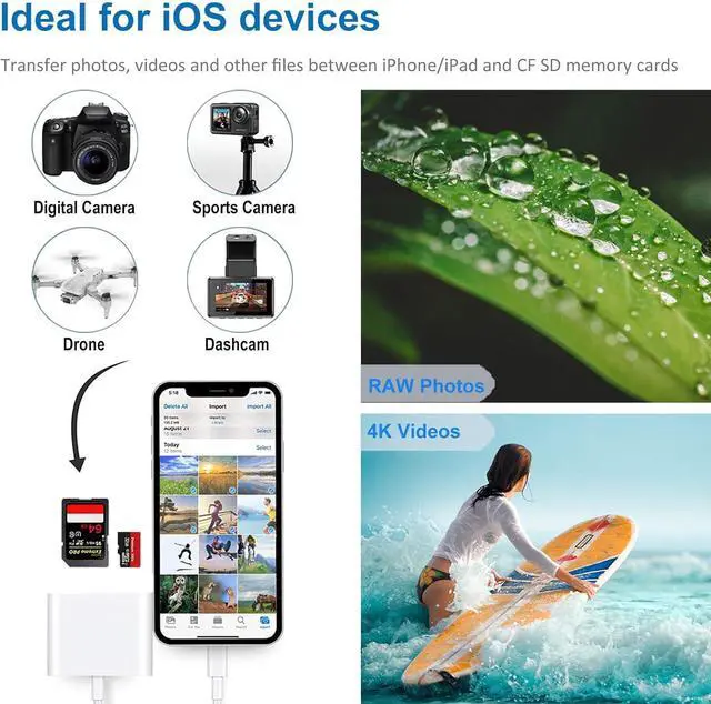 Compatibility: Our CF SD card reader is designed with wide compatibility in mind supporting iPhone/iPad models with Lightening ports as well as a variety of memory cards including standard SD/SDHC micro SD and CF cards (up to 256GB) Easy to
