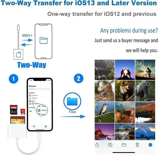 Transfer: Enjoy seamless two-way transfer functionality tailored for iOS 13 to latest iOS. Effortlessly import data from SD TF or CF cards to your iphone or export files from your iphone to SD TF or CF cards. Word PPT Excel PDF and more