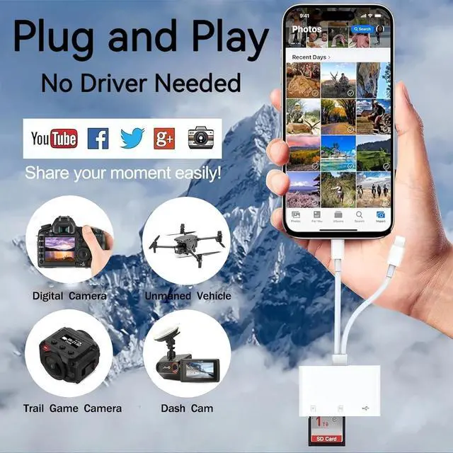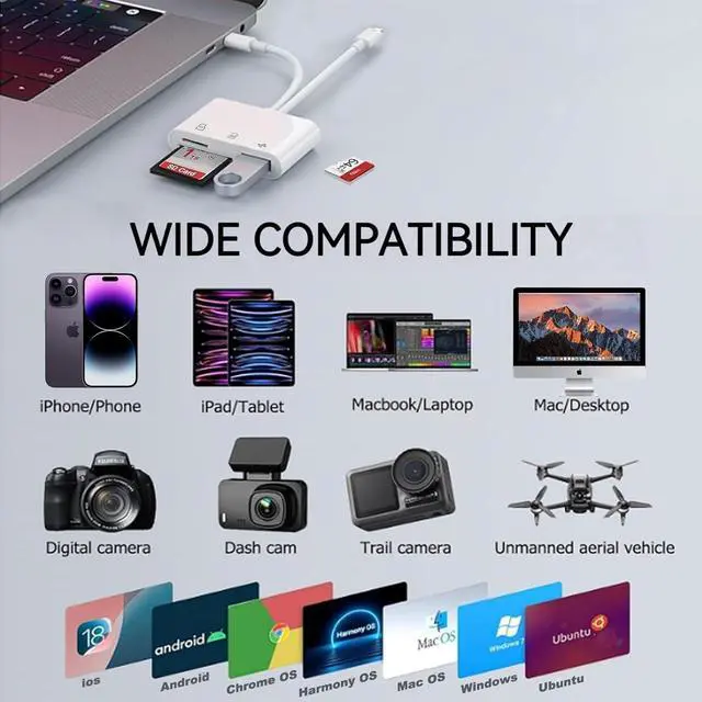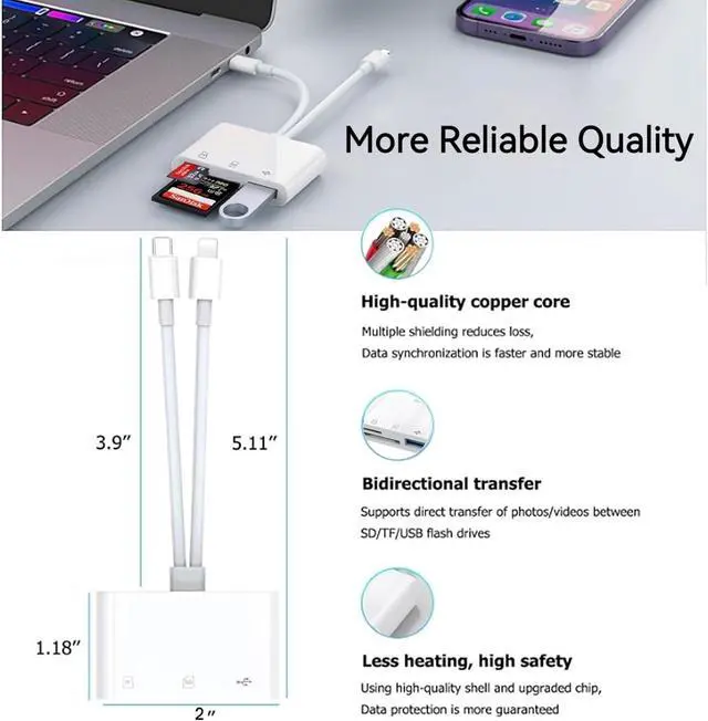 Photography Creators: The iPhone SD Card reader is design for digital/trail/hunting camera allowing you to instantly see the best moments of your shots! Supports two-way to stable transfer files/photos/music/video from SD card to iphone/ipad or from iphone/ipad to memory cards. This is a useful accessories for photographersUSB