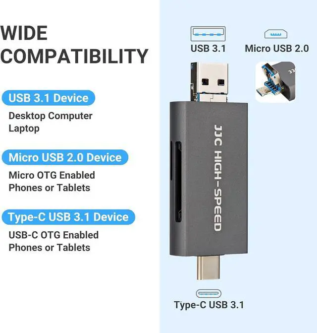 connections for wide application: USB-A 3.1 USB-C Type-C 3.1 and Micro USB 2.0. Compatible with computer laptop OTG enable phone and tablet.