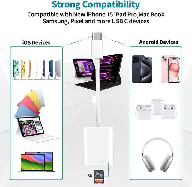 USB-C to Card ReaderEasy to transfer photos videos and backup data to your iPhone 16 15 series and iPad MacBook laptop smartphone and tablet. Supports SD SDHC UHS-I SDXC UHS-I Class 10 SDHC Ultra SDXC Micro SD adapter. Support all iPhone iPad with iOS 9.2 or later. Plug and PlayThe USB C to SD card reader for iPhone is compact and very portable. To plug and play please wait 5 seconds after connecting your device. After inserting the memory card and connecting with the iPhone click 'Photos' APP and find 'Import' then import video and photos from memory card to your iPhone or iPad share your happiness with your family and friends in real time via this iPhone 16 15 sd card reader adapter.