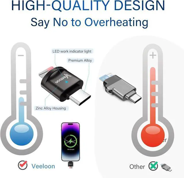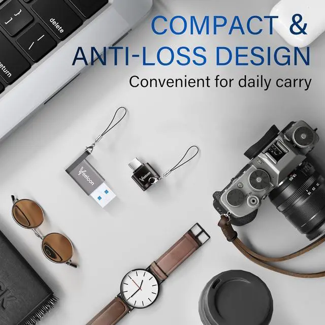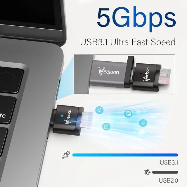 Transmission and OTG: This SD Card Reader Transfers data at speeds up to 104MB/s with UHS-I standard making it 10 times faster than USB 2.0. Supports ON-THE-GO technology allowing you to easily transfer photos videos and files between Type-C devices and a micro SD card without the need for drivers or software. Compact and Portable DesignThis USB-C Micro SD card reader is thumb-sized compact and portable featuring an anti-loss hook design that allows you to carry it along with your keys and wallet. The built-in blue indicator light makes it easy for you to check the working status of the device. To meet your diverse needs we offer a USB C to USB A adapter accessory for your selection. You can connect it to this card reader for use with desktop computers speakers in-car media players and more. Wide Compatibilitysupport SDXC SDHC SD MMC RS-MMC Micro SDXC Micro SD and Micro SDHC cards from Camera/ Gopro/ Dash Cam/ Surveillance camera Compatible with iPhone 16/15 Pro/Pro Max MacBook Pro (2023~2016) MacBook (2022~2015) iMac Pro (iMac) Surface Pro Book 2 Galaxy Tab Pro S23/ S22 Ultra/ S21/ S20 and most other USB-C / A devices. Compatible with Mac OS Windows 11/10/8/7/XP Linux Android systems.