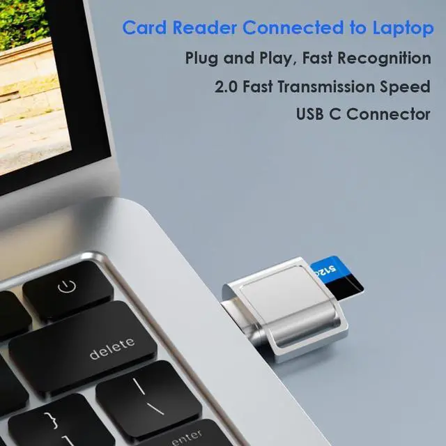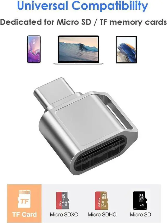 This Micro SD card reader works with devices such as laptops smartphones and tablets with USB C ports. It only works with TF/MicroSD memory cards. Compatible with TF / Micro SD / Micro SDHC / Micro SDXC memory cards. This USB-C card reader supports reading Micro SD memory cards with a capacity of 512GB and below. This USB C micro SD card reader features a zinc alloy metal casing that is beautiful and durable. Plug and Play no driver installation required. Mini size compact and portable and comes with a keychain. The built-in blue indicator light makes it easy for you to check the working status of the device.