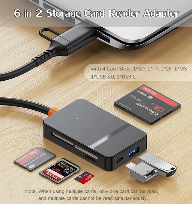 Multi Card Single Read: This compact flash card reader is equipped with 1 * SD 1 * TF 1 * CF and 1 * MS slots making it easy to transfer photos videos and files. When using multiple cards it only supports reading from one card and cannot read multiple cards at the same time. It does not support multi card multi read. USB 3.0 and