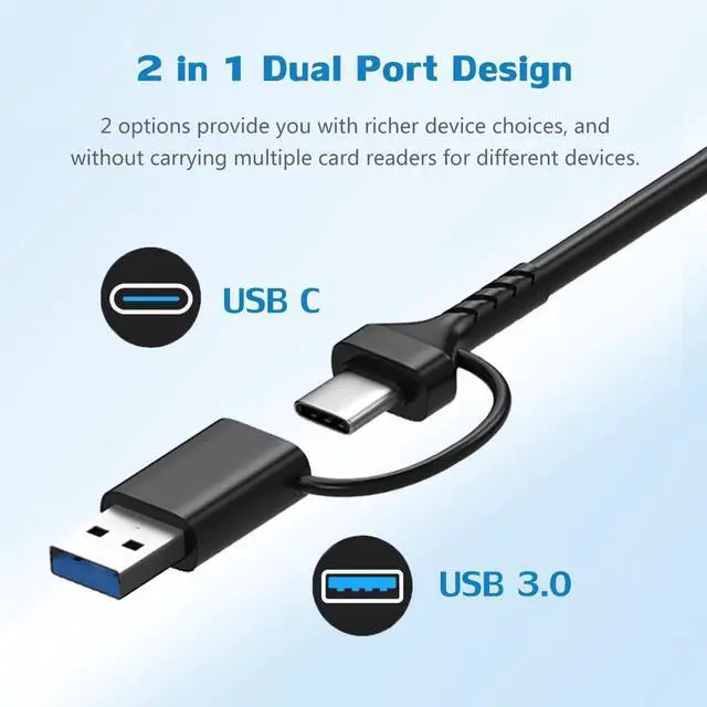 Type-C Dual Port Design: USB 3.0 / USB C to memory card adapter 2 options provide you with richer device choices. The 2 interfaces are suitable for most devices and can more effectively access laptops tablets and phones without carrying multiple card readers for different devices.