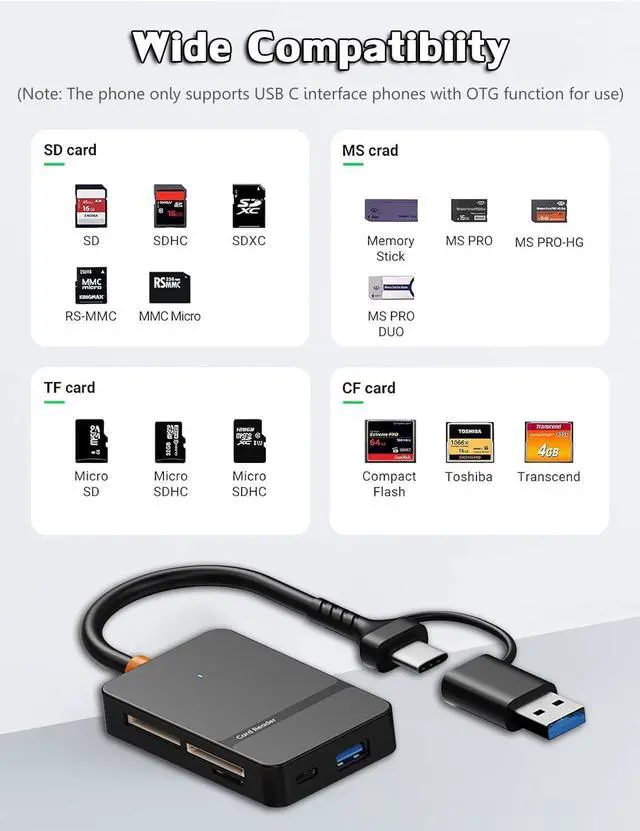 Wide Compatibility: The 4 slots of this card reader are compatible with CF TF SD SDXC SDHC Micro SD Micro SDXC Micro SDHC MS MS PRO memory cards etc.