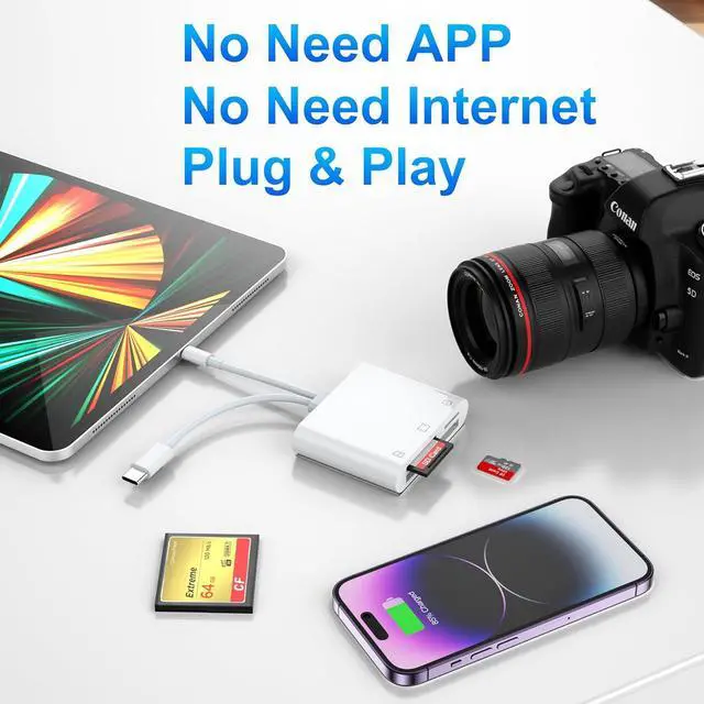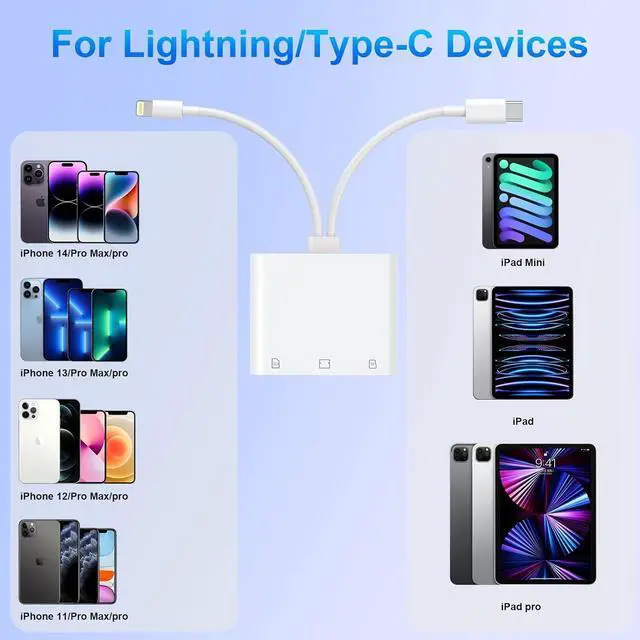 USB C/Lightning 2-IN-1 Camera to Phone Adapter The USB C/Lightning sd card reader for CF/SD/Micro SD memory card support all iPhone with iOS 9.2 and up and iPads with iOS 8.0 or later and It's easily download photos or videos from SD cards directly to the iPhone /ipad/laptop/MacBook/Android and share videos or photos with friends and relatives anytime and anywhere anytime. CF/SD/Micro SD Card ReaderMultifunction CF SD card reader for iphone ipad with lightning port compact and portable design more powerful and easy to carry. Support SD SDHC SDXC Micro SD Micro SDHC Micro SDXC CF RS MMC Memory Cards.