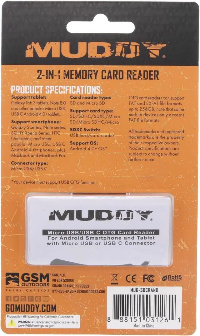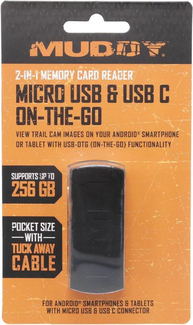 CARD COMPATIBILITY - Micro USB On-The-Go Memory Card Reader supports wide range of card types including SD SDHC SDXC MMC MMC 4.0 micro SD micro SDHC & micro SDXC; Whether you have standard-sized SD cards or micro SD cards this reader has you coveredON-THE-GO CONVENIENCE - Check trail cam images & videos on the go with Android smartphone or tablet; Micro-USB/USB/USB-C connection enables seamless access to media files directly from mobile device eliminating the need for computer or additional adaptersUSB 2.0 HUB - Equipped with one USB 2.0 hub this memory card reader offers additional connectivity options for your devices; You can connect other compatible peripherals or accessories to your smartphone or tablet expanding its functionality & versatilityOTG DEVICE SUPPORT - Muddy Memory Card Reader exclusively supports USB - OTG (On The Go) devices ensuring optimal performance & compatibility; Whether you have an OTG-enabled Android smartphone or tablet Reader is designed to integrate with your deviceCOMPLIANCE W/ INDUSTRY STANDARDS - Micro USB On-The-Go Memory Card Reader adheres to CE FCC & RoHS standards guaranteeing reliability safety & environmental compliance; This device meets rigorous quality & regulatory requirements for consumer electronics