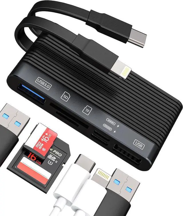 Dual Plug Design This SD Card reader features a lightning and a Type-C plug making it compatible with a wide range of devices including for iPhones iPads and USB-C enabled devices providing great versatility in usage. (NoteDoes not support reading two card slots at the same timeThe specific reading speed is related to the memory card! Multifunctional Ports Equipped with 6 female ports including 1 USB 3.0 1 USB 2.0 a TF card slot an SD card slot a Type-C charging port and a Lightning charging port. This 6-in-2 dongle caters to all your needs. Simultaneous Charging & Data Transfer This dongle allows you to charge your device while performing high-speed data transfer through the USB 3.0 or USB 2.0 port optimizing your productivity and minimizing downtime.