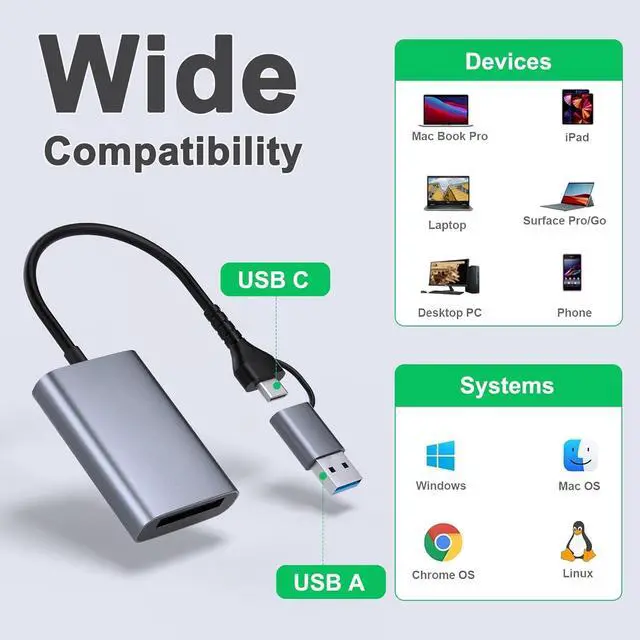 2 in 1 Design: USB C and USB 3.0 connector design provides a more efficient access to laptops tablets and phones by USB-A or USB-C slot. Plug to play easy to operate and no extra driver needed. Compatible with most systems--Mac OS Android Linux Chrome OS Windows XP/Vista/7/8/ 8.1 /10 11 etc.