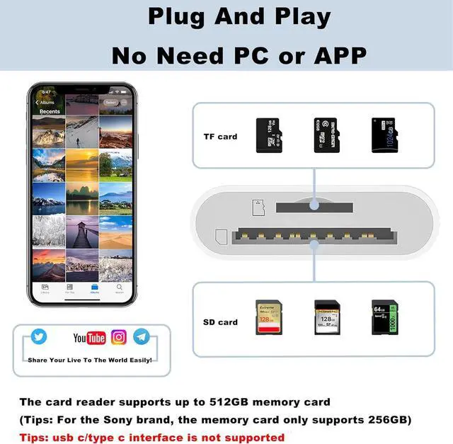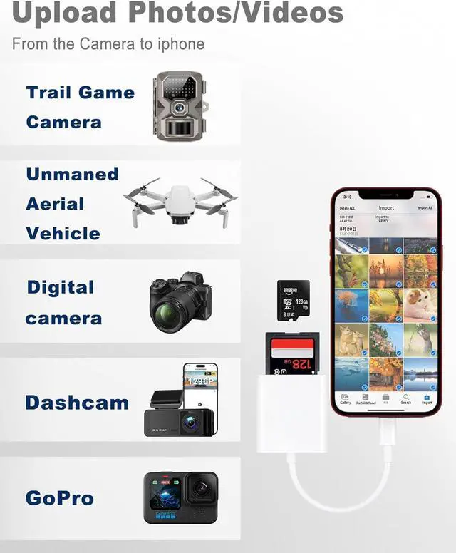 Capacity Support: The lightning to memory card Converter supports standard photo formats (including JEPG and RAW) and SD and HD video formats (including H. 264 and MEPG-4). supports sd cards from Digital Camera Sports Camera Drone Trail game Camera. This SD card to Phone adapter allows you to share the great moments to social media in real timeConvenient to carry This miniature SD card reader is compact and very portable. You will get a Lightning to SD Card Camera Reader Adapter