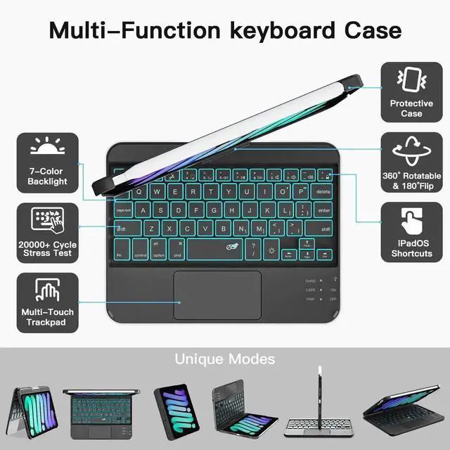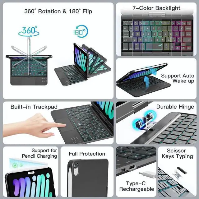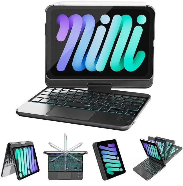 RAYMCRAFT for iPad mini 7 (A17 Pro, 2024) & Mini 6 (2021) Case with Keyboard, 7 Colors Backlit Keyboard with Trackpad, Auto Sleep/Wake, 360° Rotatable Case for iPad mini 7th 6th Gen 8.3", Black