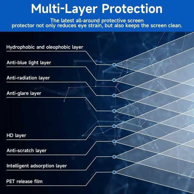 Effective Anti-Blue LightThis blue light screen protector features a layered anti-blue light design and multi-layer filtering, effectively blocking blue light to protect your eyes, especially during long computer use. Reduce eye strain and eliminate headaches.