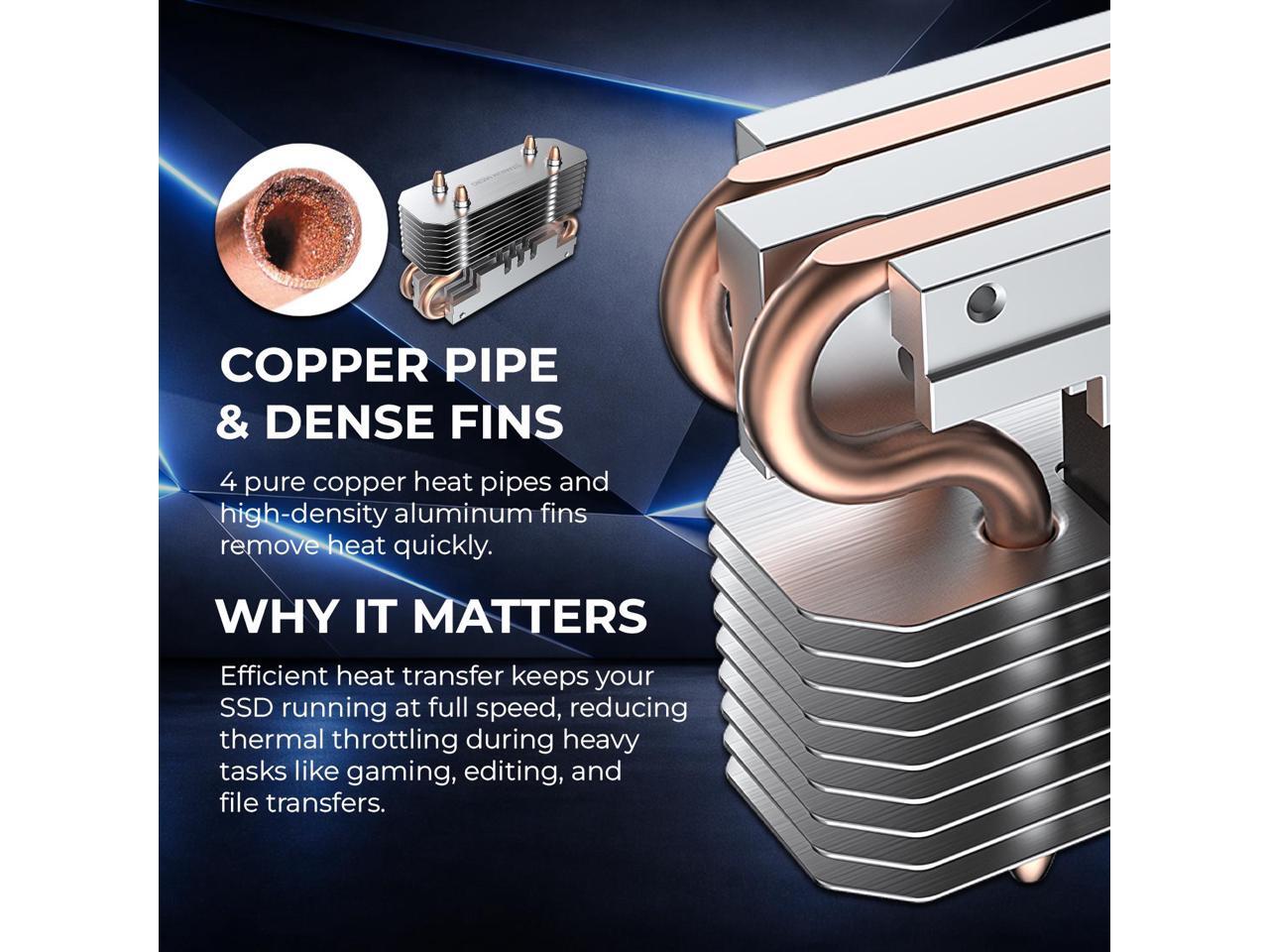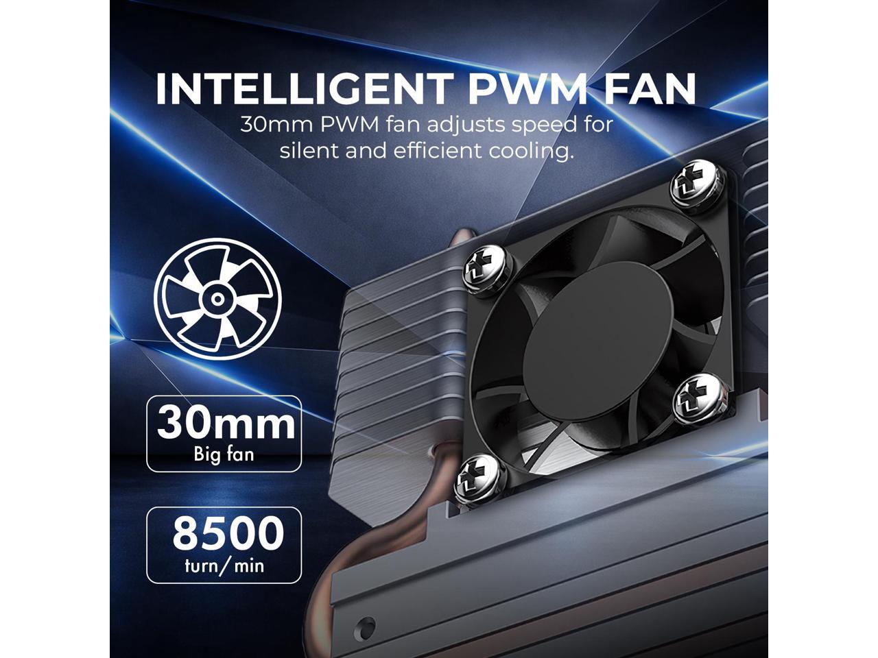 The powerful SSD heatsink M.2 NVMe 2280 cooler comes with 4 pure copper heat pipes and a 30mm PWM fan to ensure excellent heat transfer from M.2 NVMe 2280 SSDs. Perfect for maintaining optimal temperatures for your PC or gaming setup with M.2 SSD heatsink technology.