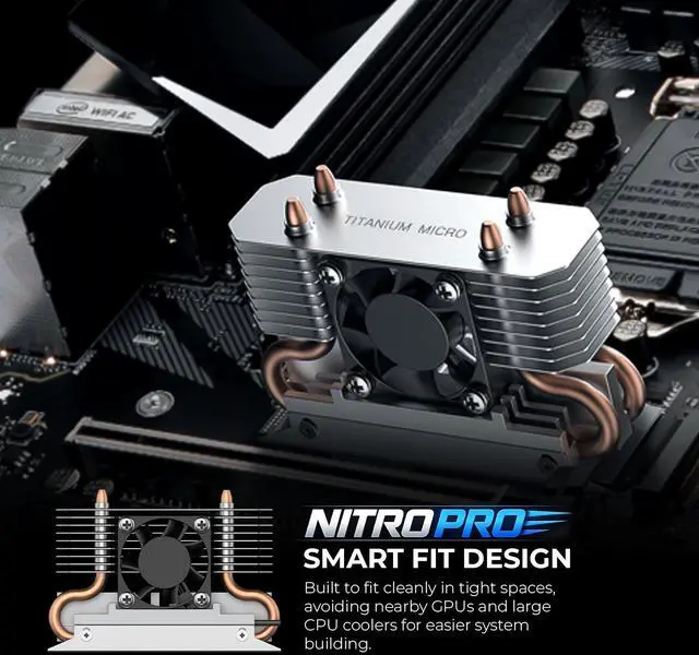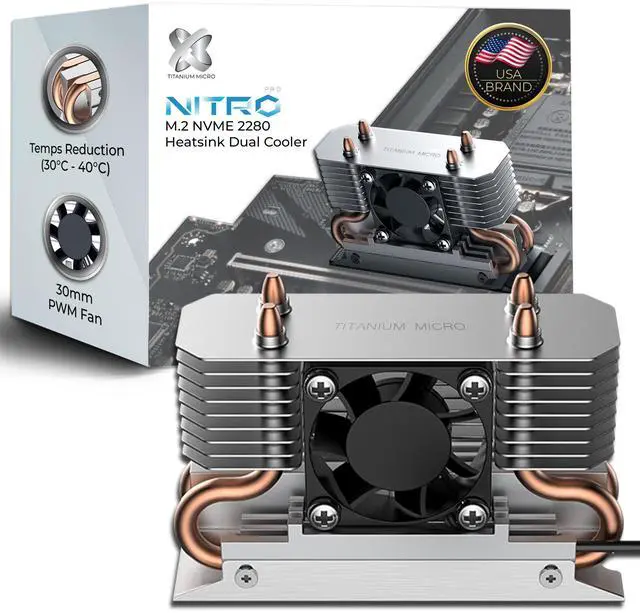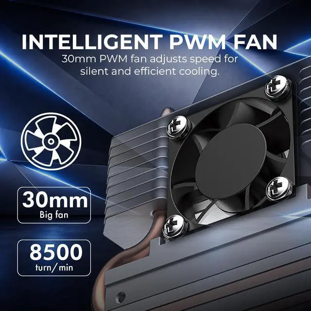 The powerful M.2 NVMe 2280 SSD cooler comes with 4 pure cooper heatpipes and 30mm RPM fan to make sure excellent heat transfer from M.2 NVMe 2280 SSD.
