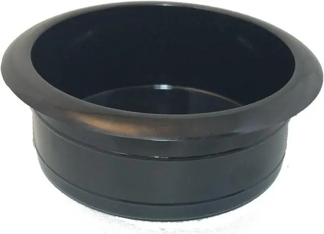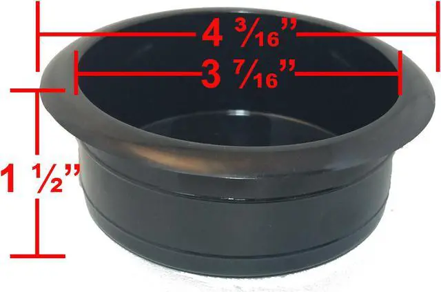 Universal replacement plastic cup holder, black. This replacement cup holder measures 1 1/2 inches (38mm) tall. The inside diameter of the cup is 3 3/8 inches (85mm). The lip of the cup is 4 3/16 inches in diameter (106mm). The cup holder will fit into a hole with a diameter between 3 1/2 and 4 3/16 inches (89mm and 106mm). It will securely hold most cups, cans and 20 ounce bottles. Suitable for recliners, sofas, theater seating, tables (poker, blackjack and pool), RV's, boats, cars, trucks, and more.